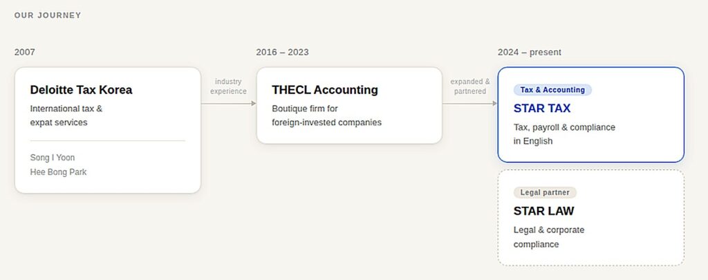 In 2024, the team took the next step: building their own independent practice and forming a strategic partnership with STAR LAW — a Korean law firm — to offer clients a more comprehensive, seamlessly coordinated service across tax, payroll, and legal compliance.